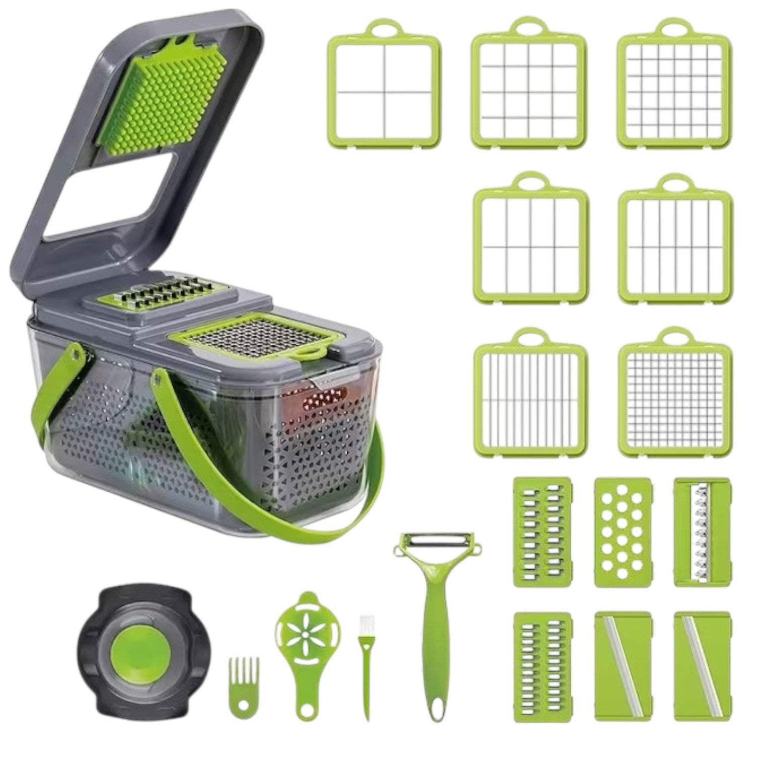 Răzătoare Multifuncțională 22 de Piese pentru Legume și Fructe, cu Funcție de Caserolă, Lame din Oțel Inoxidabil și Mâner de Protecție – Verde